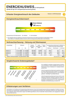 3. Seite: Auf dieser Seite werden Verbrauchswerte beschrieben. So finden Sie beispielsweise eine Farbskala, die von grün bis rot anzeigt, welchen Energieverbrauchskennwert in kWh die Immobilie besitzt. Außerdem lässt sich anhand einer weiteren Skala ablesen, welchen Wert die Immobilie hierbei im Vergleich zu anderen Gebäuden aufweist, die einem ähnlichen Bautyp entsprechen. Auch das Verhältnis des Energieverbrauchs zu einem Passivhaus wird auf dieser Seite des Energieausweises sichtbar.